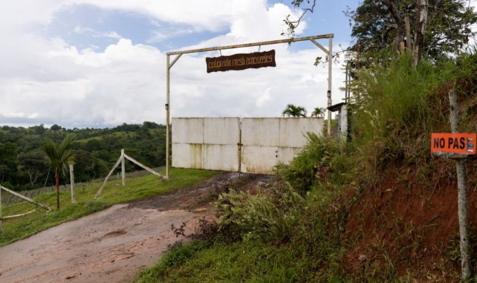 El peón se asoma desde lo alto de la cuesta. Moreno y voluminoso, está vestido con overol gris y un sombrero de ala ancha. Es parte de la indumentaria utilizada en los cultivos de piña que se supone que lo proteja al momento de aplicar pesticidas y otros productos de riesgo.